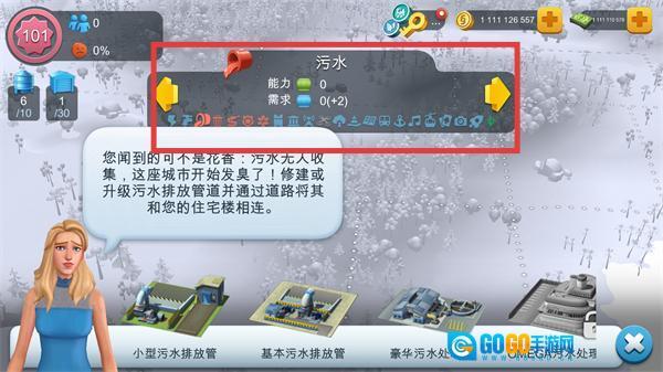 4、进入【污水】模块,查看【能力-0】【需求-0/42】,根据提示搭建【污水排放管】并与住宅楼连通。