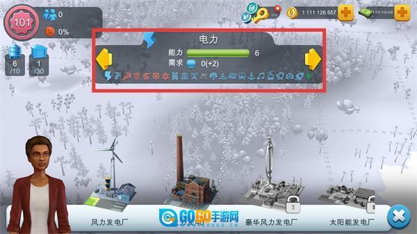 2、进入“电力”模块,查看“能力-6”“需求-0/42”,选择“风力发电厂”等设施开展建设。