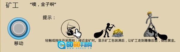 矿工:当靠近金矿时,轻触或按住开采图标进行开采。等显示矿工的包裹已满后,让矿工走到雕像后方,将黄金倒出来,这样就完成收集了。
