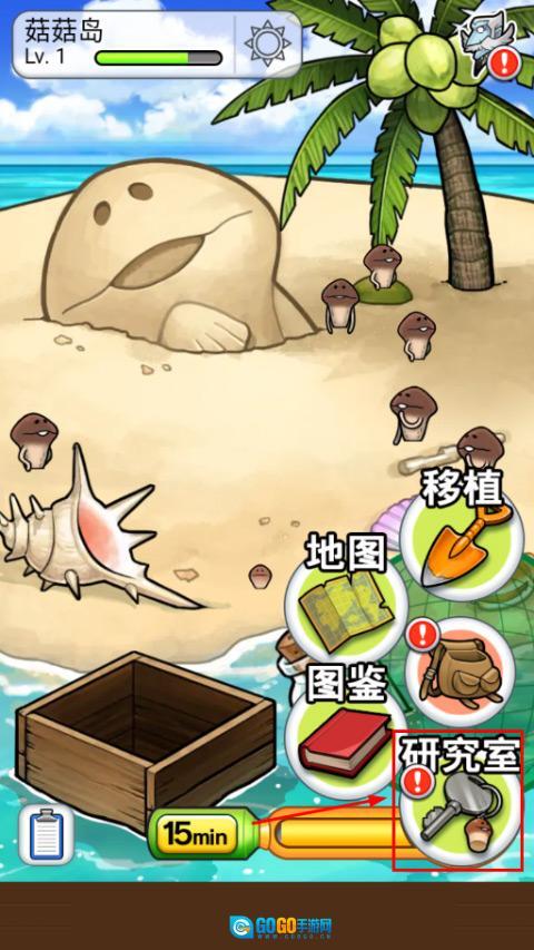 1、先打开菇菇栽培研究室这款游戏,进入游戏界面后,找到右下角的背包按钮并点击,接着再点击研究室选项;