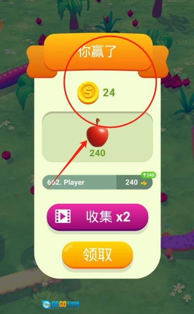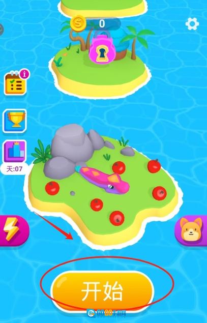 1、点击“开始游戏”按钮,操控小蛇在岛上灵活穿梭,吃掉苹果就能让它快速长大。