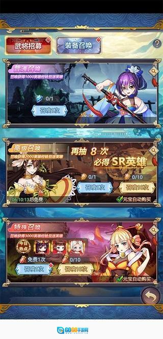 高级召唤:获得2000英雄经验且送英雄,召唤消耗高级招募令,用于元宝英雄招募,招募令消耗元宝活动,英雄池包含SSR级、SR级、S级、A级。