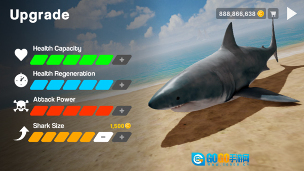 -多样鲨鱼选择,包含银鲨、白鲨、虎鲨等,每种鲨鱼外观与属性(速度、攻击力)各有差异,选择丰富