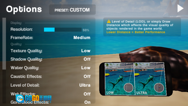 1、启动鲨鱼之怒游戏,在游戏正式开始前,点击界面右上角的齿轮图标,即可对游戏的画质、画面效果等参数进行调整;