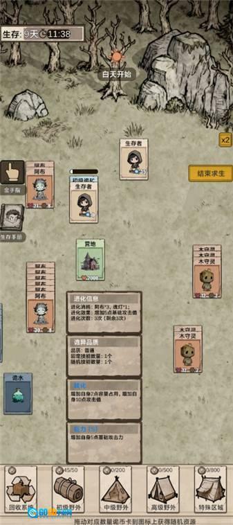 1.昼夜循环生存机制:游戏的生存玩法设置了时间限制,白天阶段有12分钟时长,玩家在此期间能不受限制地收集各类资源、收容诡异生物以及打造装备物品;到了夜晚,时间不再受限制,游戏进入防御战斗模式,此时只有诡异卡能被用于战斗环节。另外,每隔10天就会有BOSS级别的诡异生物发起入侵,成功击败它们后,玩家可以获取到丰富的资源奖励。