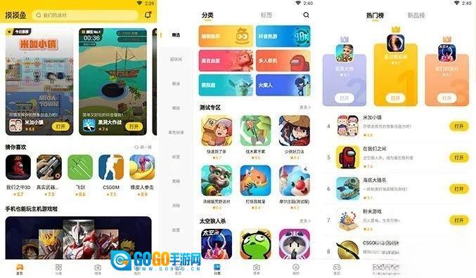 摸摸鱼和常见的商店类App差别不大,首页、分类、榜单、我的这四个主要标签页设计得很直观,用户几乎不需要额外学习就能上手。在细节处理上,摸摸鱼对视频元素的重视程度更高,轮播展示的游戏视频介绍非常醒目,目的是让玩家以最快的速度了解游戏玩法,从而吸引用户的关注。