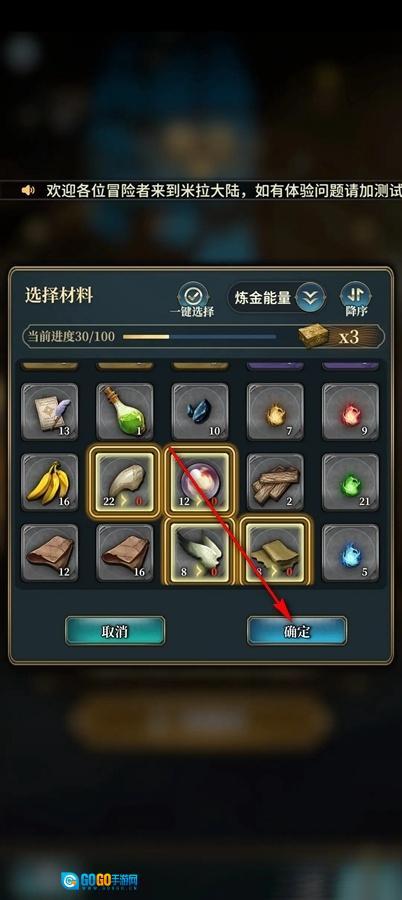 然后就去炼金,选择材料点击【确定】