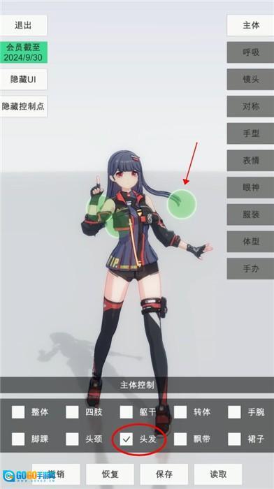 1、点击主体后,在下方栏位选择主题所控制的部位,玩家就能对不住模特的整体姿势进行调整,其中也包含头发的漂移度等细节。