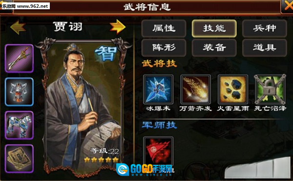 贾诩的属性其实不算突出,不过对零元党来说相当友好,他的军师技能够提升招降概率!清兵技能没什么实际效果,但火雷五发要是能命中三发,通常就能打掉对方一半血量了!大招可以对大片区域造成固定减血和中毒效果,也算是比较实用的!