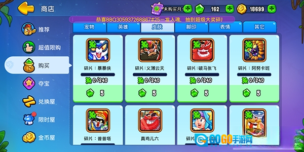 英雄皮肤能够改变英雄的外观和技能特效,所有皮肤都得积攒够对应的同名皮肤碎片才能兑换。皮肤碎片可以在商店里购买,每个碎片售价五钻石,并且会一直上架不会下架。