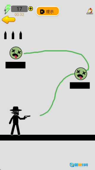 2. 如图所示,首个关卡是新手关卡,玩家只需依照绿色线条描绘出子弹的路径就行。
