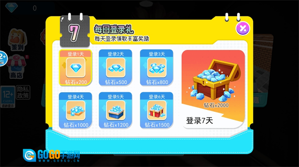 1、进入游戏界面后,根据屏幕上的提示,先点击每日签到领取当日奖励,若能连续签到七天,还可获得更丰厚的钻石奖励。