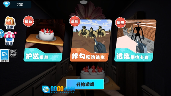 2、屏幕上会呈现出护送蛋糕、修勾吃鸡逃生、逃离雨中卡嘉这三种闯关模式,你可以根据自己的意愿选择想要挑战的模式并点击进入,随后按照模式内呈现的画面开展冒险挑战。