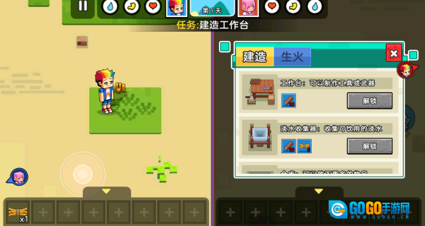 和伙伴做好分工,点击收集散落在各个地方的基础资源,再借助工作台把这些资源合成更高级的工具和建筑材料。