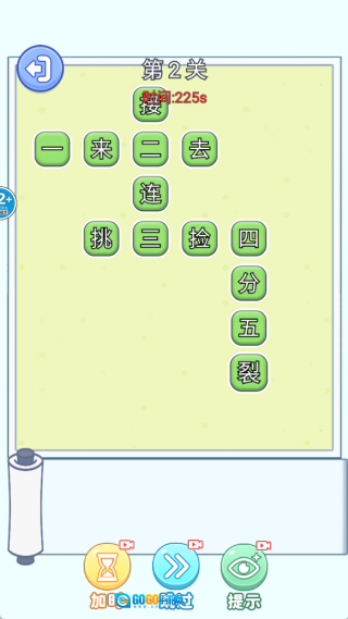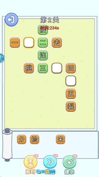 3、随着通关进度的不断推进,空格的布局会愈发复杂,成语的难度也将逐步提升,拼字与接龙的双重挑战会层层升级,让整个过程充满进阶的乐趣。