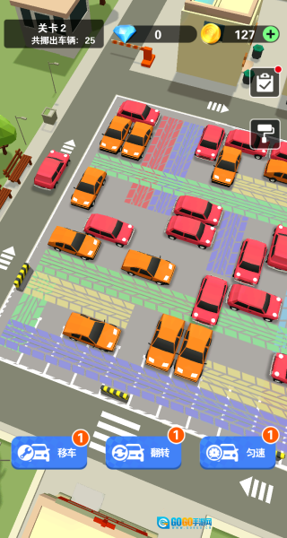 1. 核心玩法为借助手指滑动使关卡内的车辆进行水平或垂直方向的移动,最终目标是帮助被其他车辆围堵的红色目标车辆顺利从停车场出口驶出。