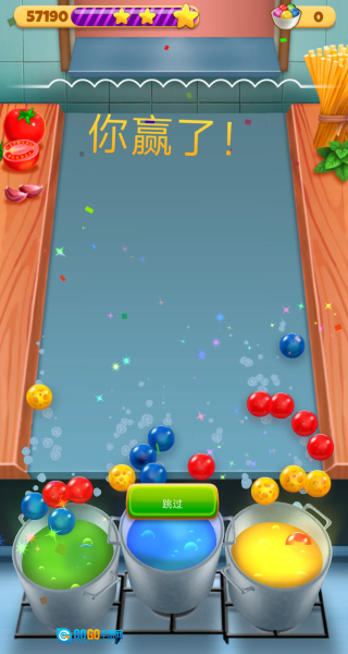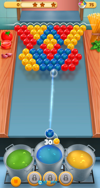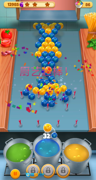 1. 调整发射角度,把屏幕底部的食材泡泡射向顶部的泡泡群,只要和两个或两个以上同颜色的泡泡连在一起,就能消除并收集这些泡泡。