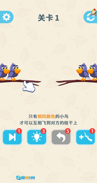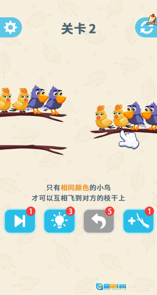 2. 你得通过滑动来引导小鸟们滚动到一起,助力它们成群结队地从枝头飞离,最后让整段枝干变得空无一物就能通关啦。
