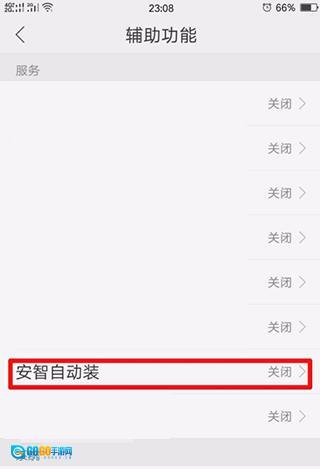 6、进入这个「辅助功能」页面后,向下滑动页面找到并点击「安智自动装」的功能选项。