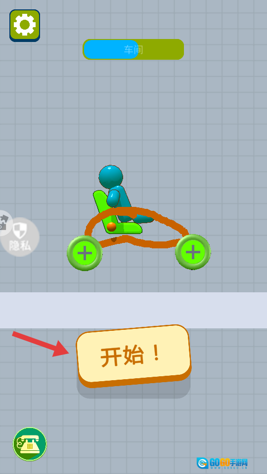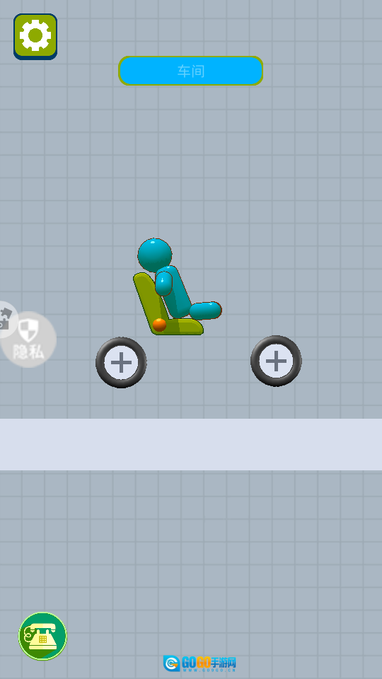 1、进入游戏车间界面,观察蓝色小人与座椅、轮子的布局,熟悉基础构造元素,准备打造车辆。
