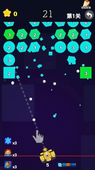 3、遇到多数字标识的方块布局时,建议先聚焦数字小的方块,快速清理掉浅层目标,之后借助弹球的反弹特性来攻击数字较大的方块。