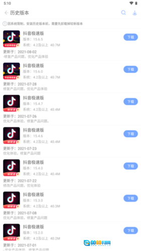 3、在历史版本页面能够查看抖音极速版的全部版本,只需选择并点击你想要的那个版本即可。