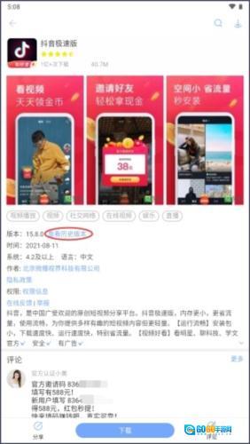 2、进入安智市场的抖音极速版详情页后,点击“版本”栏最右侧的“查看历史版本”按钮