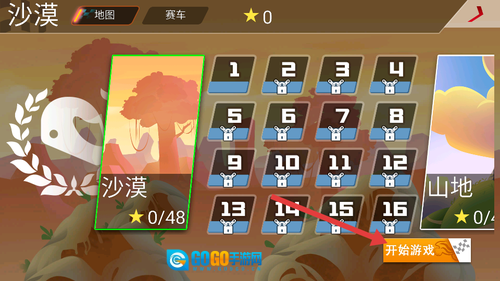 2、建议先从第一关的沙漠地图开启冒险,等成功解锁所有沙漠关卡后,就能开启更具挑战性的山地冒险之旅了。