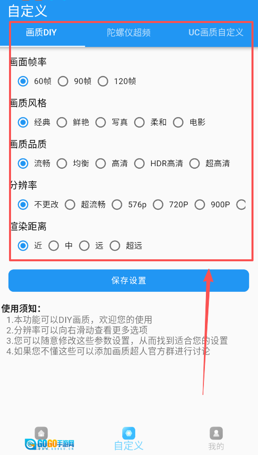 2、接下来是第二步,开展个性化定制操作:点击底部的“自定义”标签页,在该页面中,你能够分别对画面帧率、画质风格、画面品质以及分辨率进行设置。