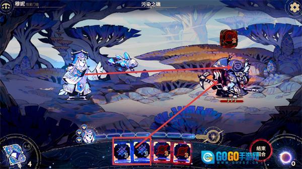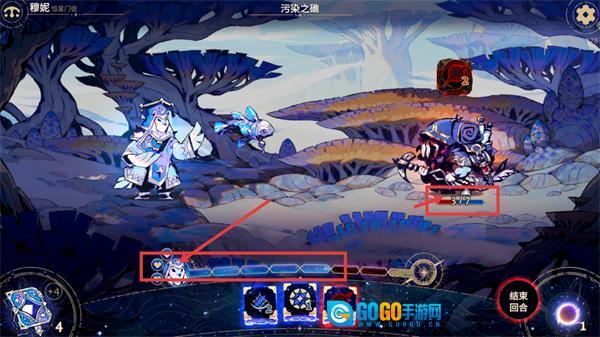2、在【污染之礁】场景里,操控【穆妮-恒星门链】这个角色,运用带有【3】点伤害的卡牌,去攻击当前生命值为【7/7】的敌方单位。