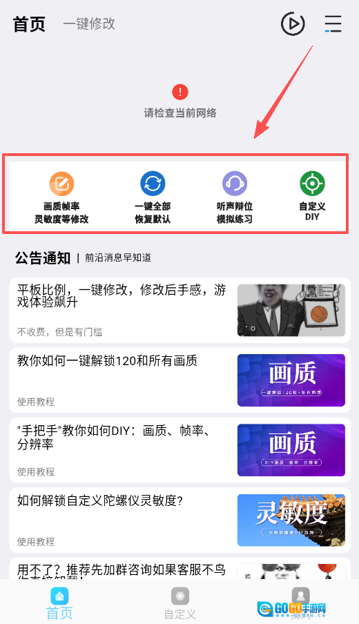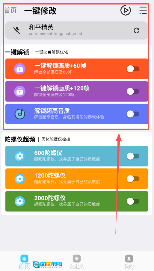 首先,在首页可以找到一键修改的选项,针对和平精英这款游戏,该选项提供了画质帧率、陀螺仪灵敏度等多种功能。