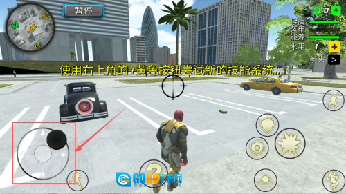 3、角色移动控制:通过左侧的虚拟摇杆,可操控角色在城市场景内移动。