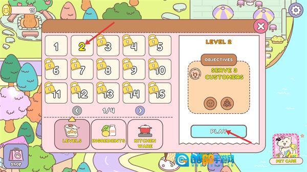 1、进入关卡选择界面后,选中【LEVEL2】,确认关卡目标为【SERVE3-CUSTOMERS】,点击【PLAY】按钮就能进入该关卡开启经营。