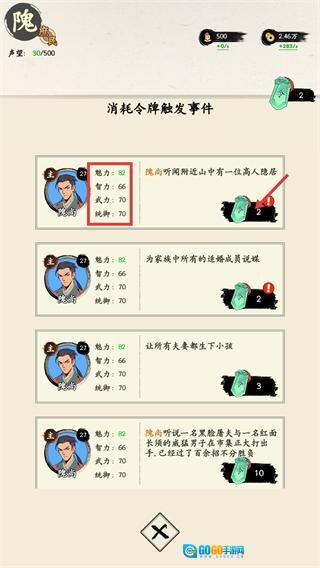 2、进入消耗令牌触发事件的界面后,使用【2-令牌】来触发【隗尚听闻附近山中有一位高人隐居】这一事件,接着选择该事件以推动剧情进展。
