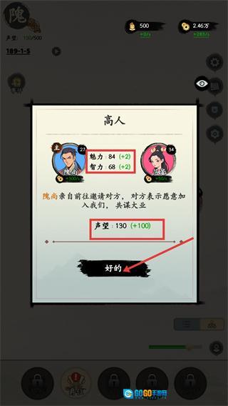 4、成功邀请到高人后,你将获得【魅力:84(+2)】、【智力:68(+2)】以及【声望:130(+100)】的属性加成,点击【好的】按钮关闭该提示即可继续进行游戏。