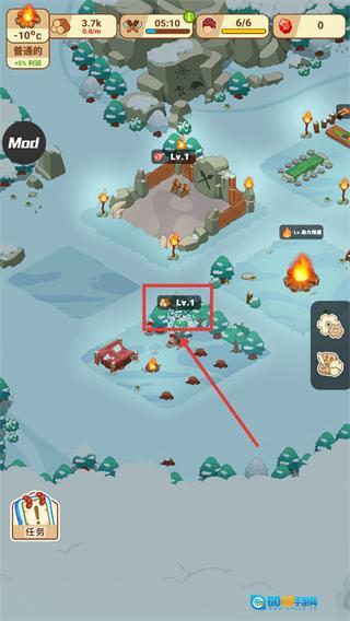 1、处于【-10℃】环境,木材当前【3.7k】,点击【Lv.1】建筑推进【任务】,维持资源与设施的发展节奏。