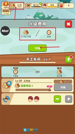 2、进入【木工车间-Lv.1】界面,消耗【3.7k/758-木材】并等【20s】,点击【升级】提升其产出效率。