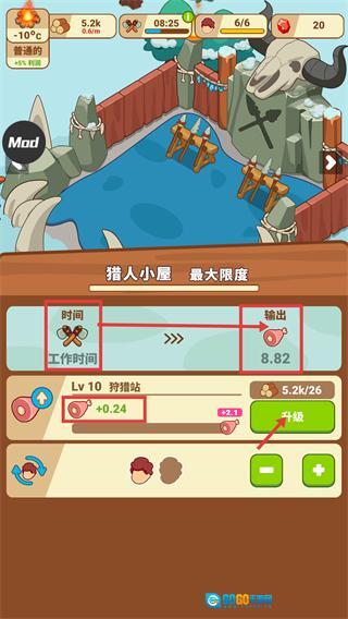 3、在【猎人小屋-最大限度】界面,升级【Lv.10-狩猎站】消耗对应资源,点击【升级】增强狩猎相关产出。