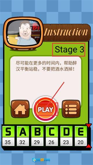1、进入【Stage-3】,遵循提示帮助醉汉平衡站稳不洒酒水,点击【PLAY】按钮开启本关卡的挑战。