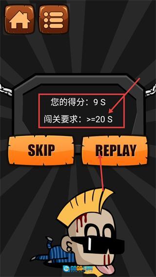 4、当前得分【9S】未达【闯关要求->=20S】,点击【REPLAY】按钮重新挑战以提升平衡操作时长。