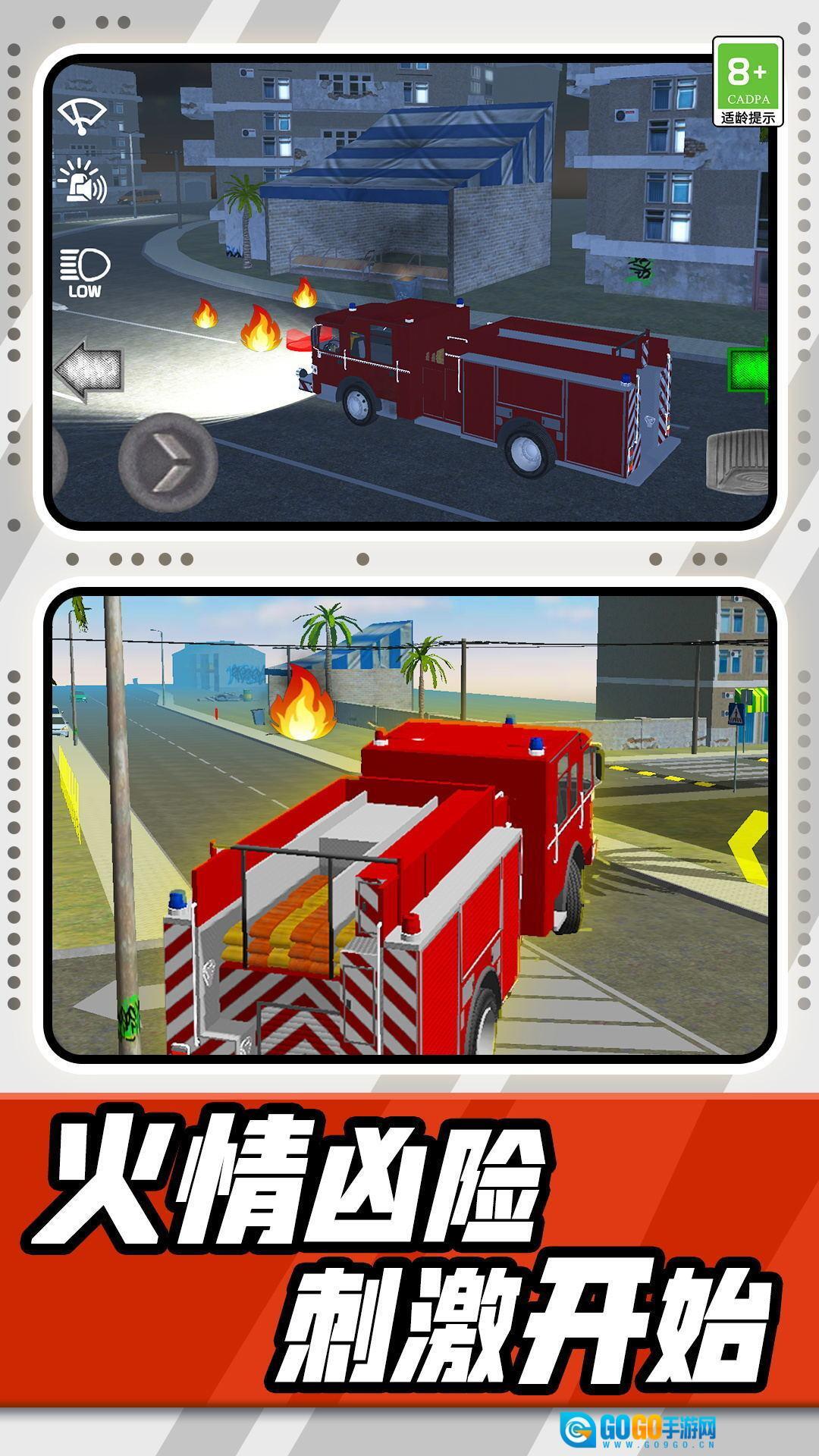 2、救援任务:丰富多样的游戏设计带来紧张刺激的消防救援任务,不同类型的消防车为您提供各具特色的驾驶体验与消防操作方式。