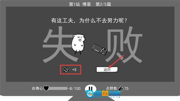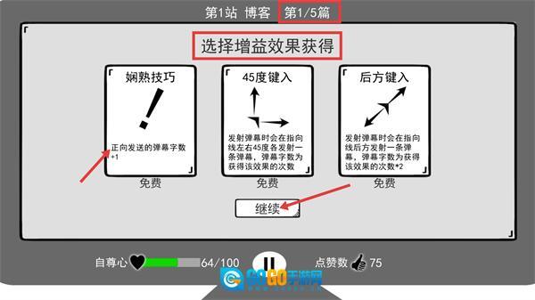 1、进入博客关卡后,选择增益效果,选定后点击【继续】按钮,借助增益推进关卡,同时关注【自尊心】与【点赞数】的数值变化。