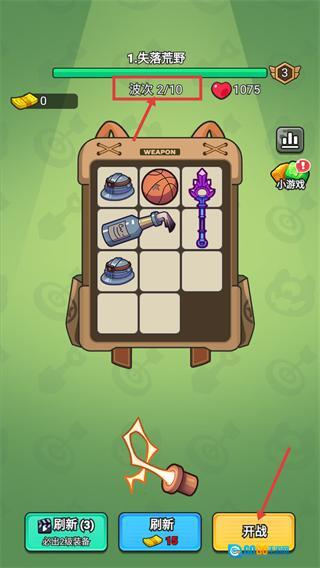 4、推进至【失落荒野-波次2/10】,整理背包内的武器装备后,点击【开战】按钮继续挑战下一波敌人。