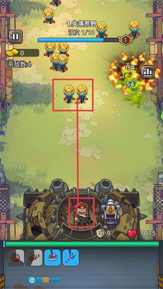 2、处于【失落荒野-波次1/10】关卡,操控角色攻击敌人,关注【杀敌数-4】与【生命值-1075】,借助武器持续输出。