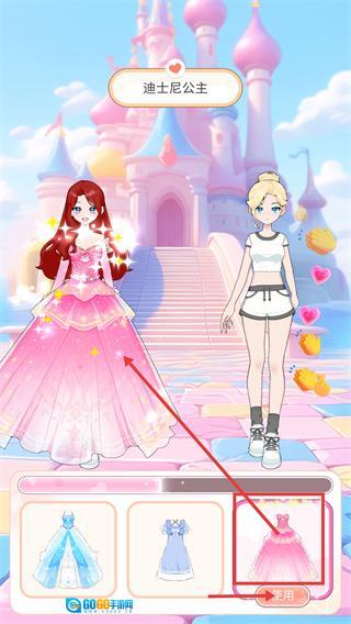 3、切换至服饰选择栏,选中适配【迪士尼公主】主题的【粉色公主裙】并点击【使用】,让己方角色装扮更契合主题。