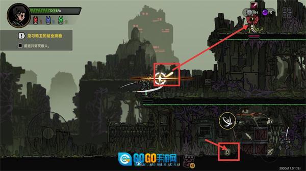 2、推进任务过程中,点击右侧的【加号图标】来获取道具,使用【环形技能图标】释放技能并命中上方的敌人,与此同时要留意【72/120-生命值】的续航情况。