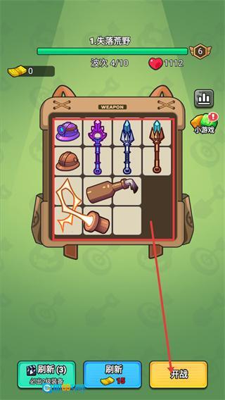 1、在【失落荒野-波次4/10】的背包界面中,对法杖类装备和攻击道具进行整理,确认好搭配方案后点击【开战】按钮,即可开启该波次的关卡挑战。
