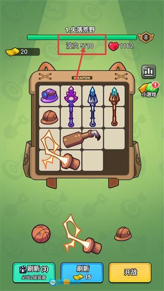 4、进入【失落荒野-波次5/10】的背包界面,当前持有【金币-20】,将现有装备整理完毕后点击【开战】按钮,挑战下一波敌人。