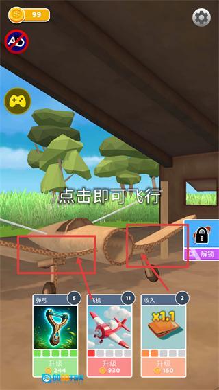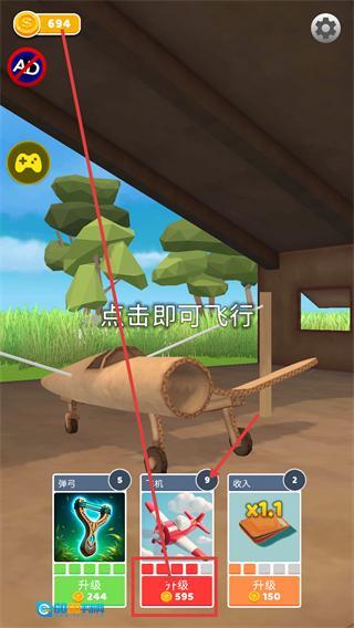 1、花费【595】金币把【飞机】提升到9级,界面会显示【点击就能飞行】的提示,另外还能留意【弹弓】之类其他道具的升级情况。