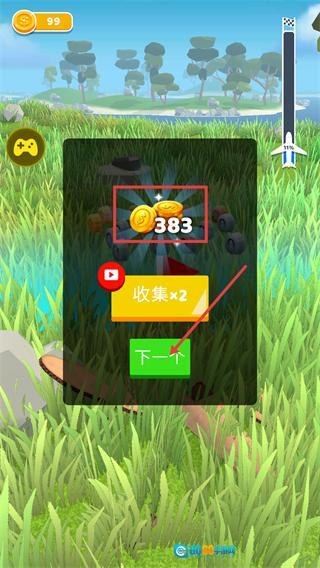 4、飞行结束后将获得【383】金币奖励,您可以点击【下一个】按钮继续飞行,也可以选择观看广告并点击【收集×2】来获取双倍奖励。